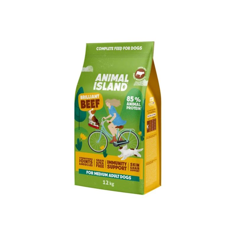 Animal Island Adult Dog Beef to pełnoporcjowa, doskonale zbilansowana sucha karma dla dorosłych psów średniej wielkości. Receptura została oparta na wysokiej jakości wołowinie (aż 59%) i hydrolizowanej wątrobie wieprzowej, co sprawia, że aż 85% białka w karmie pochodzi ze źródeł zwierzęcych. Główne źródło węglowodanów stanowią ziemniaki, które są lekkostrawne i bezglutenowe.