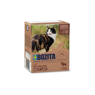 Bozita mokra karma w kartoniku z mięsem łosia w galaretce to szwedzka jakość i smakowite rozwiązanie żywieniowe dla Twojego kota. Jest to pełnoporcjowa, bezzbożowa karma, która w swoim składzie nie zawiera glutenu, cukru, soi i sztucznych konserwantów. Te pyszne mięsne kawałki są pełnowartościowym posiłkiem dla Twojego pupila, każda porcja to aż 93% mięsa i zawiera aminokwasy, witaminy oraz minerały zaspokajające codzienne zapotrzebowanie Twojego kota. Jest także wsparciem dla układu odpornościowego, ponieważ zawiera aminokwas Macrogard. Swoim smakiem i aromatem zachwyci nawet wyszukane podniebienie Twojego pupila.