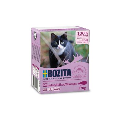 Bozita mokra karma w kartoniku z krewetkami w sosie to szwedzka jakość i smakowite rozwiązanie żywieniowe dla Twojego kota. Jest to pełnoporcjowa, bezzbożowa karma, która w swoim składzie nie zawiera glutenu, cukru, soi i sztucznych konserwantów. Te pyszne mięsne kawałki są pełnowartościowym posiłkiem dla Twojego pupila, każda porcja to aż 93% mięsa i zawiera aminokwasy, witaminy oraz minerały zaspokajające codzienne zapotrzebowanie Twojego kota. Jest także wsparciem dla układu odpornościowego, ponieważ zawiera aminokwas Macrogard. Swoim smakiem i aromatem zachwyci nawet wyszukane podniebienie Twojego pupila.