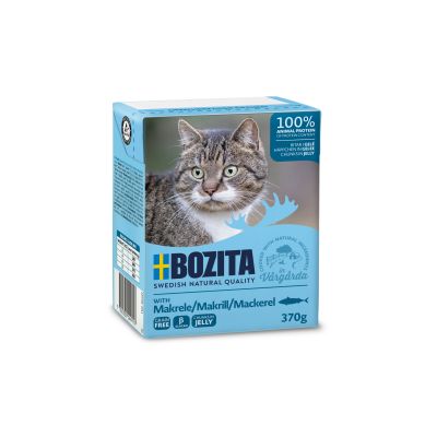 Bozita mokra karma w kartoniku z makrelą w galaretce to szwedzka jakość i smakowite rozwiązanie żywieniowe dla Twojego kota. Jest to pełnoporcjowa, bezzbożowa karma, która w swoim składzie nie zawiera glutenu, cukru, soi ani żadnych barwników i sztucznych konserwantów. Te pyszne mięsne kawałki są pełnowartościowym posiłkiem dla Twojego pupila, każda porcja to aż 93% mięsa i zawiera aminokwasy, witaminy oraz minerały zaspokajające codzienne zapotrzebowanie Twojego kota. Jest także wsparciem dla układu odpornościowego, ponieważ zawiera aminokwas Macrogard. Swoim smakiem i aromatem zachwyci nawet wyszukane podniebienie Twojego pupila.