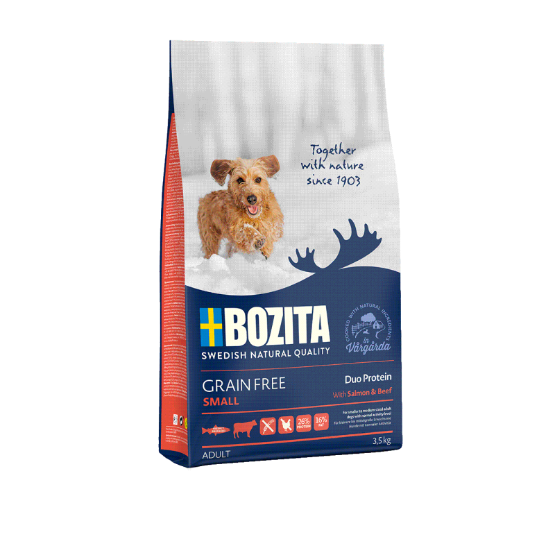 Bozita Bez Dodatku Zbóż Salmon & Beef Small to pełnoporcjowa karma dedykowana dorosłym psom mniejszych ras o normalnym poziomie aktywności. Zawiera 26% białka, z czego 80% to białko zwierzęce, oraz 16% tłuszczu, co zapewnia optymalne odżywienie i energię dla Twojego pupila.