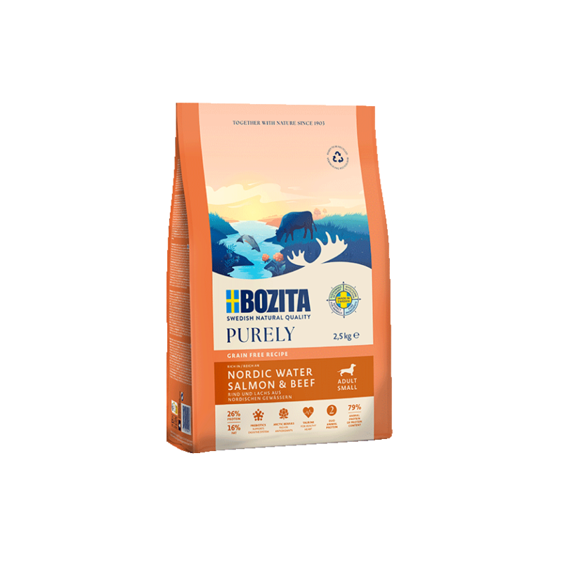 Purely Adult Small Salmon & Beef to pełnowartościowa, bezzbożowa karma opracowana specjalnie dla dorosłych psów mniejszych ras o normalnym poziomie aktywności. Zawiera 26% białka i 16% tłuszczu, co zapewnia odpowiednią ilość energii i składników odżywczych potrzebnych na co dzień.