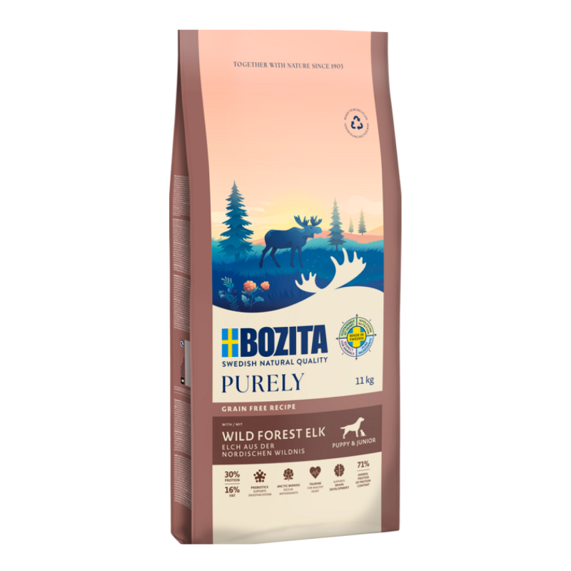 Purely Puppy & Junior Elk to bezzbożowa, wysokobiałkowa karma stworzona specjalnie dla szczeniąt, młodych psów oraz ciężarnych i karmiących suk. Zawiera 30% białka i 16% tłuszczu, co zapewnia młodym psom energię i wsparcie w okresie intensywnego wzrostu i rozwoju.Karma bazuje na świeżo przygotowanym mięsie łosia i kurczaka, co gwarantuje wysoką jakość białka, a dodatkowe jaja dostarczają niezbędnych aminokwasów. Formuła wzbogacona została o arktyczne jagody – naturalne źródło przeciwutleniaczy, oraz prebiotyczny błonnik FOS, który wspiera zdrową florę bakteryjną jelit. Tauryna zawarta w karmie wspiera zdrowie serca, a odpowiednio dopasowany rozmiar krokietów sprawia, że karma nadaje się dla wszystkich ras psów.