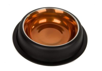 Piękna miseczka dla Twojego pupila, czarna na zewnątrz, miedziana w środku. Metalowa, na gumie, by zapobiec przesuwaniu. Miska zależnie od wybranego rozmiaru jest przeznaczona i dla psa i dla kota.