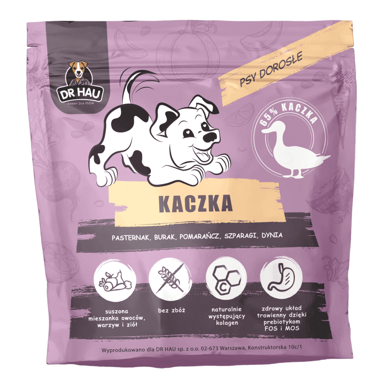 Karma DR HAU najwyższej jakości karma sucha dla psów dorosłych, na bazie kaczki. Bogata zawartość składników odżywczych oraz witamin, które zadbają o zdrowie oraz witalność Twojego pupila. Dodatek szparag to świetne źródło żelaza, które wspomaga prawidłowe funkcjonowanie układu krążenia.