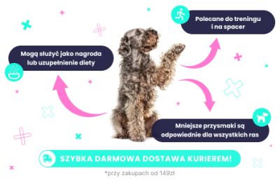 więc idealnym uzupełnienie karmy podstawowej dla psów.Wspaniały smak powoduje, że mogą służyć jako nagroda do tresury lub przekąska między posiłkami.