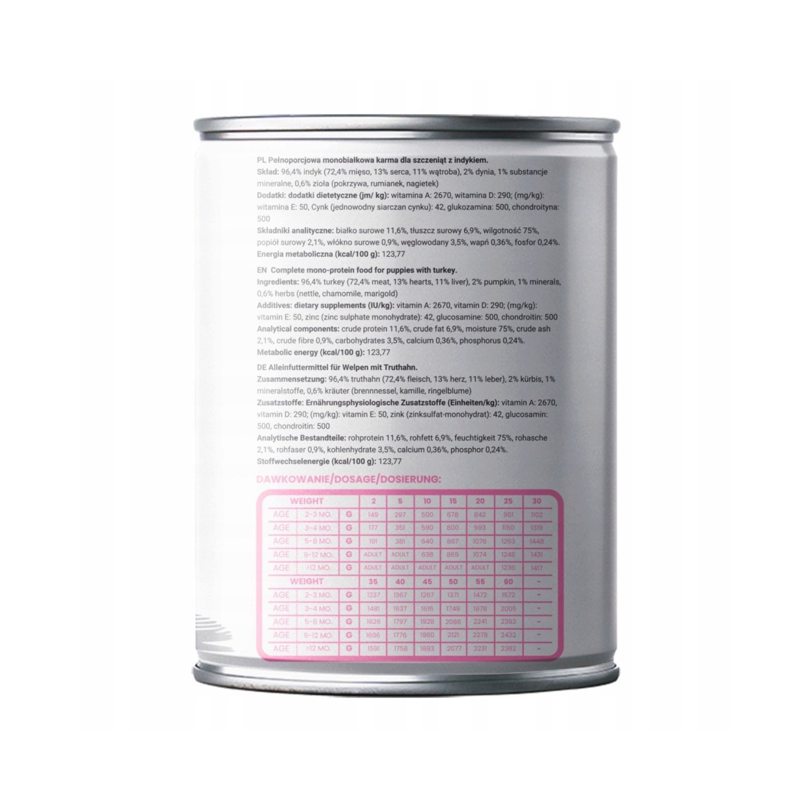 Skład karmy mokrej: 96,4% indyk (72,4% mięso mięśniowe, 13% serca, 11% wątroba), 2% dynia, 1% substancje mineralne, 0,6% zioła (pokrzywa, rumianek, nagietek).