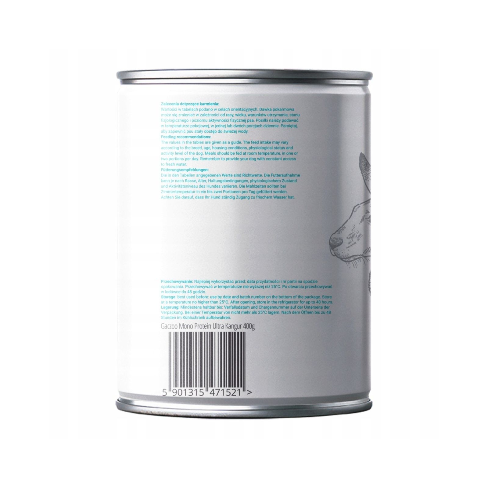 Skład karmy mokrej: 96,4% kangur (mięso mięśniowe), 2% borówki, 1% substancje mineralne, 0,3% owoc dzikiej róży, 0,3% zioła (liście malin, ostropest plamisty).