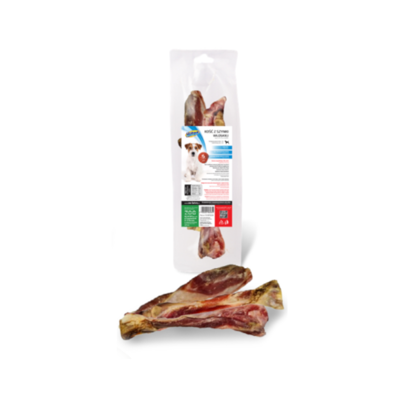 Hilton Kość z szynki włoskiej to naturalna i apetyczna przekąska, która doskonale zaspokaja naturalną potrzebę gryzienia i żucia Twojego pupila. Przygotowana z suszonej tradycyjnymi metodami szynki włoskiej, kość jest bogata w kawałki soczystego mięsa, które dostarczają psu niezapomnianych wrażeń smakowych.