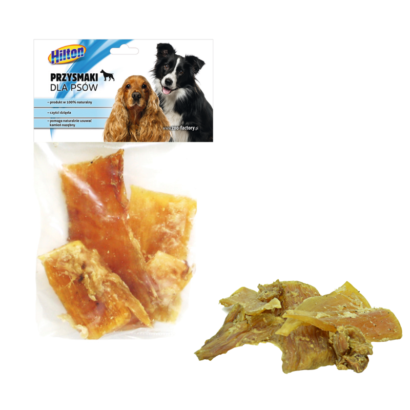 Naturalne suszone miękkie piersi z kurczaka, Hilton Pyszne Super snacki dla psa, opakowanie 100gWysokiej jakości naturalne, suszone paseczki piersi z kurczaka , nie zawierają sztucznych dodatków, cukrów ani zbędnych tłuszczy. Zawierają wysoką zawartość mięsa oraz białka, są więc idealnym uzupełnienie karmy podstawowej dla psów.Wspaniały smak powoduje, że mogą służyć jako nagroda do tresury lub przekąska między posiłkami.