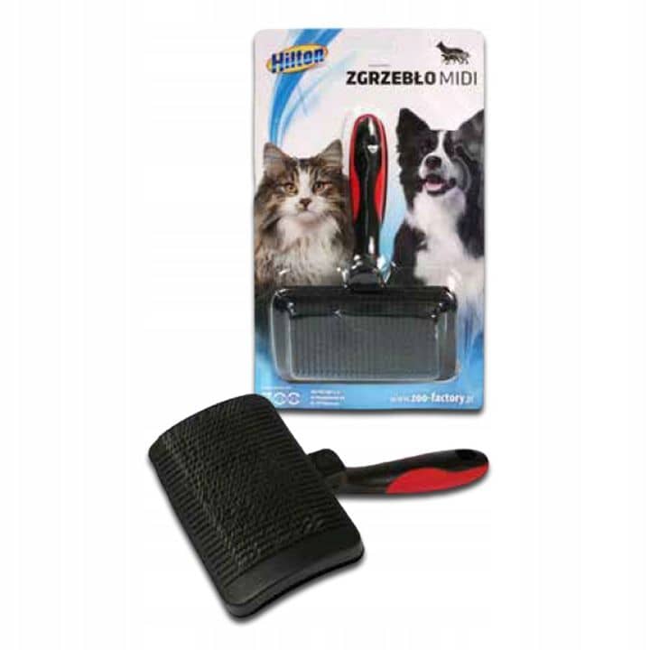 Hilton zgrzebło plastikowe dla psów ras dużych, średnich, małych oraz dla kotów. Delikatne szpileczki poradzą sobie z martwym włosem i podszerstkiem, oczyszczając sierść i nadając jej połysk.