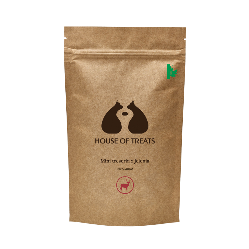 Mini treserki z jelenia to naturalne i lekkostrawne przysmaki, które doskonale sprawdzą się jako nagroda podczas treningu, spacerów czy codziennych interakcji z psem. W 100% naturalny skład, bez dodatku kości, gliceryny i sztucznych substancji, sprawia, że są bezpieczne nawet dla wrażliwych czworonogów. Dzięki unikalnym właściwościom mięsa jelenia, treserki są świetnym wyborem dla psów skłonnych do alergii, ponieważ dziczyzna rzadko wywołuje reakcje uczuleniowe.Mięso jelenia jest bogate w nienasycone kwasy tłuszczowe omega-3, składniki mineralne i pierwiastki śladowe, dzięki czemu wspiera zdrowie skóry, sierści i ogólną kondycję organizmu. Ze względu na brak gliceryny i innych zmiękczaczy, treserki są naturalnie twardsze, choć w porównaniu do innych wariantów House of Treats (wołowych, kaczych czy króliczych) są najdelikatniejsze i bardziej miękkie. To czyni je świetnym wyborem dla psów w każdym wieku, od szczeniąt po seniorów, a także dla kotów – choć warto pamiętać, że nie wszystkie koty akceptują takie smakołyki.
