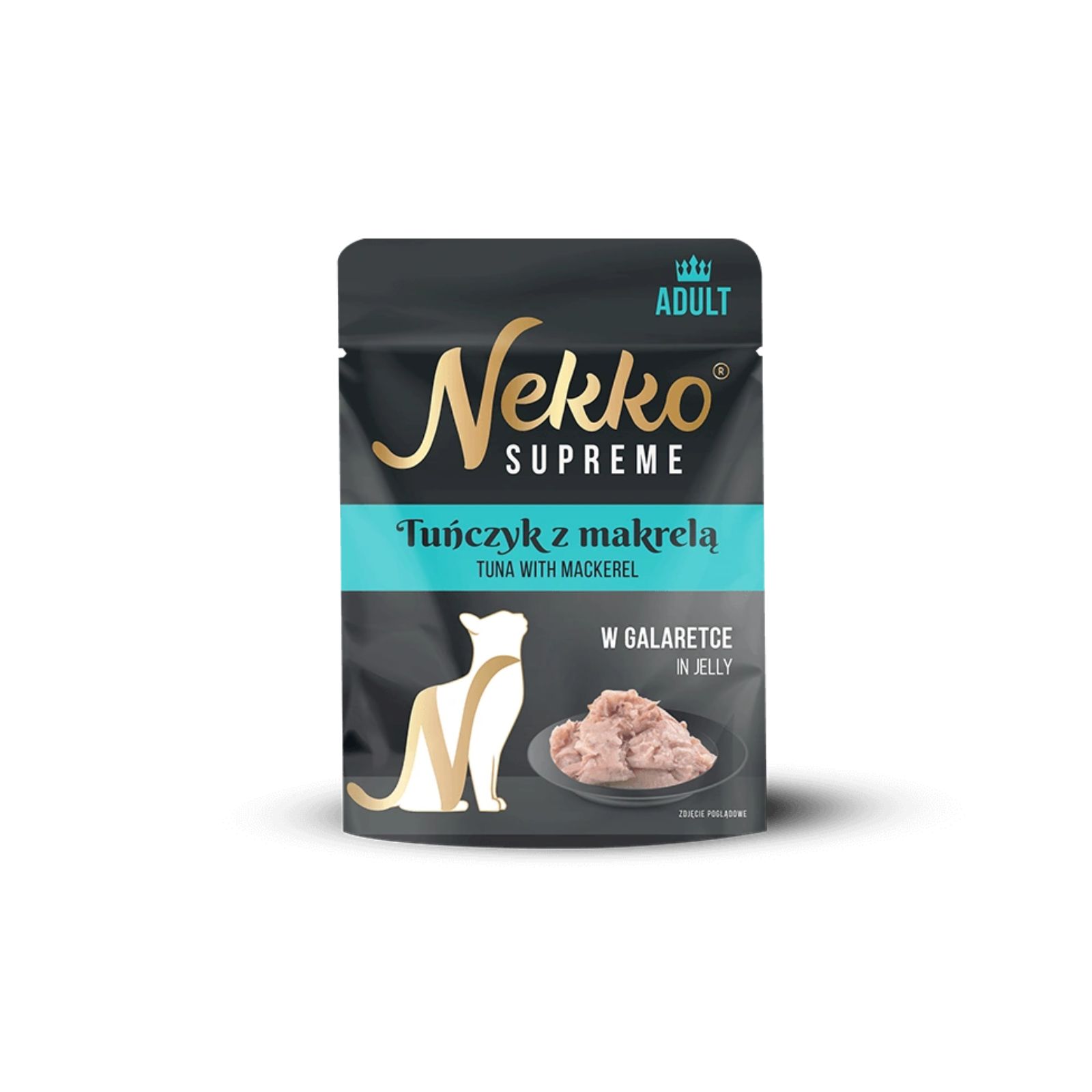 NEKKO SUPREME to linia wyjątkowych karm uzupełniających, stworzona z myślą o dorosłych kotach, które zasługują na najwyższy standard żywienia. Saszetka z tuńczykiem i makrelą w delikatnej galaretce to połączenie 100% naturalnych składników, wysokiej smakowitości i lekkostrawnej formuły. Kawałki mięsa klasy human grade nie tylko przyciągają aromatem, ale również dostarczają wartościowego białka oraz witamin, wspierających zdrowie układu nerwowego, wzroku i odporności.Receptura pozbawiona cukru, konserwantów i sztucznych dodatków jest odpowiednia nawet dla kotów z wrażliwym układem trawiennym. Mięso z tuńczyka to doskonałe źródło witaminy D3 i B12, a dodatek makreli wzbogaca posiłek w witaminę A i kwas foliowy. Galaretka zapewnia odpowiednie nawodnienie oraz ułatwia trawienie. To idealna przekąska lub uzupełnienie codziennej diety kota – nawet tego najbardziej wybrednego.