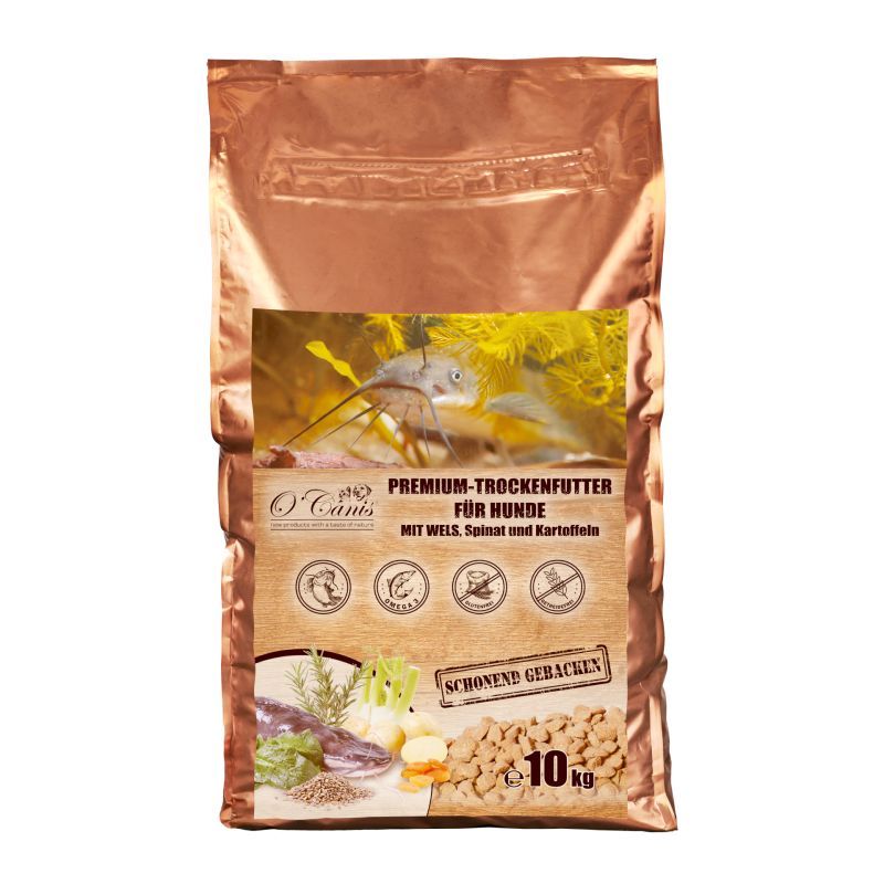 Pełnoporcjowa sucha karma O'Canis premium z suma, ziemniaka i szpinaku to bardzo dobrze strawna karma dla dorosłych psów wszystkich ras. Poddana procesowi pieczenia, dzięki czemu nie dodaje się do niej żadnych sztucznych dodatków czy tłuszczy, jest bezzbożowa i bezglutenowa.