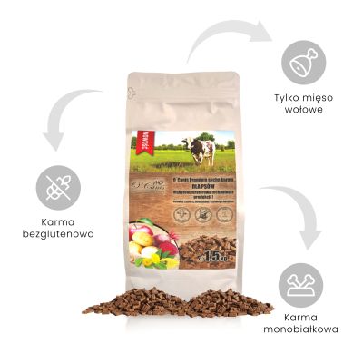 Skład karmy dla psa: 59% wołowina (suszona i mielona), 20% proso, 7% ziemniaki (suszone i mielone), 5% buraki, 3% jabłko, 2% wodorosty, 1% suszone wrzosy, 1% olej z dzikich ryb, 1% witaminy i minerały , 0,5% mieszanka ziół ( liście pokrzywy, skrzyp polny, mniszek lekarski), 0,3% siemię lniane, 0,1% mieszanka olejów ( olej rzepakowy i konopny tłoczony na zimno), 0,1% wysłodki buraczane.