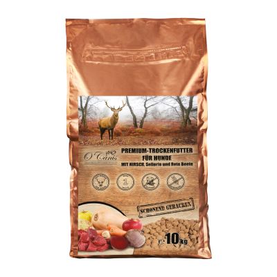 Pełnoporcjowa sucha karma pieczona O'Canis premium z jelenia, selera i buraków to bardzo dobrze strawna karma dla dorosłych psów wszystkich ras. Karma jest bezzbożowa i bezglutenowa, ma prosty czysty skład, bez żadnych sztucznych dodatków ani tłuszczy.