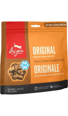 Przysmak dla kota Orijen to 100% surowego lub świeżego mięsa, nie zawiera żadnych sztucznych konserwantów. Mięso z kurczaka i indyka z chowu bezklatkowego oraz flądry łowionej w naturalnym środowisku, jest poddawane procesowi liofilizacji, dzięki czemu przekąska ma bardzo skoncentrowany smak i aromat, jest źródłem naturalnym składników odżywczych, które są niezbędne dla Twojego kota.