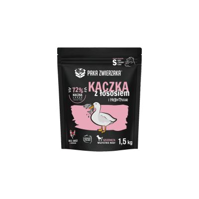 Karma PAKA ZWIERZAKA SUPERPREMIUM doskonale zbilansowana najwyższej jakości karma sucha dla szczeniąt, na bazie mięsa kaczki, łososia, warzyw i ziół pozyskiwanych od lokalnych dostawców. Nie zawiera konserwantów, zbóż, grochu, kukurydzy, soi, sztucznych barwników i aromatów. Karma zapewni pełnowartościowy posiłek, który dostarczy Twojemu młodemu pupilowi niezbędnych witamin i mikroelementów, jest idealnym rozwiązaniem dla psów z delikatnym żołądkiem i nietolerancją na zboża. To 100% naturalnych składników, wysoka smakowitość i łatwa przyswajalność.