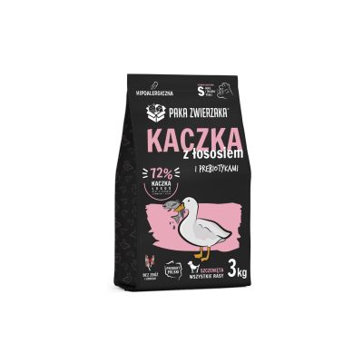 Karma PAKA ZWIERZAKA SUPERPREMIUM doskonale zbilansowana najwyższej jakości karma sucha dla szczeniąt, na bazie mięsa kaczki, łososia, warzyw i ziół pozyskiwanych od lokalnych dostawców. Nie zawiera konserwantów, zbóż, grochu, kukurydzy, soi, sztucznych barwników i aromatów. Karma zapewni pełnowartościowy posiłek, który dostarczy Twojemu młodemu pupilowi niezbędnych witamin i mikroelementów, jest idealnym rozwiązaniem dla psów z delikatnym żołądkiem i nietolerancją na zboża. To 100% naturalnych składników, wysoka smakowitość i łatwa przyswajalność.
