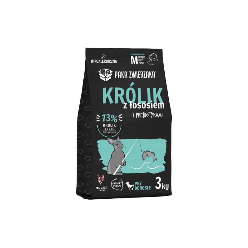 Karma PAKA ZWIERZAKA SUPERPREMIUM doskonale zbilansowana najwyższej jakości karma sucha na bazie królika i łososia, warzyw i ziół pozyskiwanych od lokalnych dostawców. Nie zawiera konserwantów, zbóż, grochu, kukurydzy, soi, sztucznych barwników i aromatów. Karma zapewni pełnowartościowy posiłek, który dostarczy Twojemu młodemu pupilowi niezbędnych witamin i mikroelementów, jest idealnym rozwiązaniem dla psów z delikatnym żołądkiem i nietolerancją na zboża. To 100% naturalnych składników, wysoka smakowitość i łatwa przyswajalność.