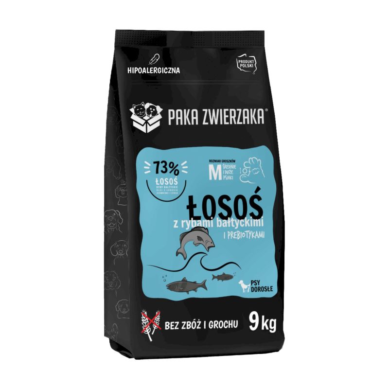 Karma PAKA ZWIERZAKA SUPERPREMIUM doskonale zbilansowana najwyższej jakości karma sucha na bazie łososia, ryb bałtyckich, warzyw i ziół pozyskiwanych od lokalnych dostawców. Nie zawiera konserwantów, zbóż, grochu, kukurydzy, soi, sztucznych barwników i aromatów. Karma zapewni pełnowartościowy posiłek, który dostarczy Twojemu pupilowi niezbędnych witamin i mikroelementów, jest idealnym rozwiązaniem dla psów z delikatnym żołądkiem i nietolerancją na zboża. To 100% naturalnych składników, wysoka smakowitość i łatwa przyswajalność.