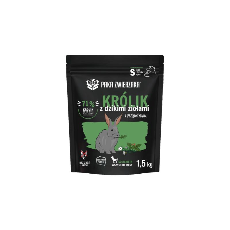 Królik, będący głównym składnikiem, to białe mięso o wysokiej zawartości białka i niskiej zawartości tłuszczu, znane z łatwości trawienia. Dodatek dzikich ziół i oleju z łososia wzbogaca dietę o niezbędne kwasy tłuszczowe Omega-3, które są kluczowe dla zdrowia skóry i sierści. Ziemniaki jako źródło węglowodanów zapewniają energię niezbędną do zabawy i wzrostu.