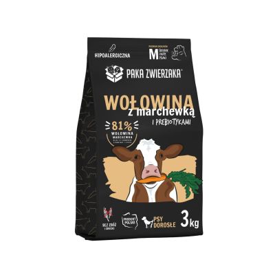 Bezzbożowa karma sucha z wołowiną i marchewką to doskonale zbilansowany posiłek jakości superpremium, stworzony z myślą o psach z delikatnym układem pokarmowym lub nietolerancją pokarmową. Dzięki hipoalergicznej formule pozbawionej zbóż, grochu, soi, kukurydzy oraz sztucznych barwników i konserwantów, sprawdzi się u czworonogów wymagających szczególnej diety.Głównym składnikiem karmy jest wysokiej jakości mięso wołowe, bogate w witaminy z grupy B, żelazo, cynk i selen – składniki niezbędne dla zdrowia układu nerwowego, prawidłowego metabolizmu i odporności. Aromatyczna wołowina w połączeniu z marchewką dostarcza nie tylko wyjątkowego smaku, ale też beta-karotenu, wspierającego wzrok i funkcje obronne organizmu.