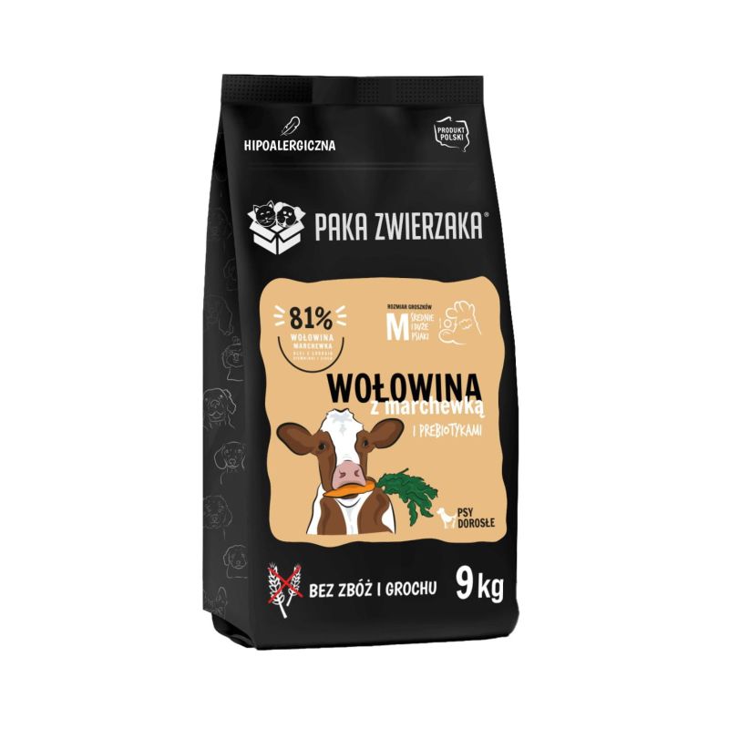 Bezzbożowa karma sucha z wołowiną i marchewką to doskonale zbilansowany posiłek jakości superpremium, stworzony z myślą o psach z delikatnym układem pokarmowym lub nietolerancją pokarmową. Dzięki hipoalergicznej formule pozbawionej zbóż, grochu, soi, kukurydzy oraz sztucznych barwników i konserwantów, sprawdzi się u czworonogów wymagających szczególnej diety.Głównym składnikiem karmy jest wysokiej jakości mięso wołowe, bogate w witaminy z grupy B, żelazo, cynk i selen – składniki niezbędne dla zdrowia układu nerwowego, prawidłowego metabolizmu i odporności. Aromatyczna wołowina w połączeniu z marchewką dostarcza nie tylko wyjątkowego smaku, ale też beta-karotenu, wspierającego wzrok i funkcje obronne organizmu.