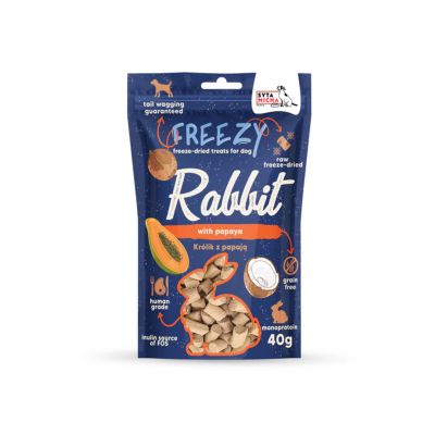 Syta Micha FREEZY z królikiem, papają i kokosem to wyjątkowe liofilizowane smaczki, które łączą w sobie delikatność mięsa z królika z tropikalną świeżością owoców. Dzięki lekkostrawnej formule i monobiałkowemu składowi, są idealne dla psów z wrażliwym układem pokarmowym lub skłonnościami do alergii. Papaja dostarcza enzymów wspomagających trawienie, a kokos wzmacnia odporność oraz wspiera zdrowie skóry i sierści.Proces liofilizacji pozwala zachować maksymalną wartość odżywczą i naturalny smak bez użycia konserwantów czy sztucznych dodatków. Smaczki są lekkie, higieniczne i wygodne do podania – sprawdzą się zarówno podczas treningu, jak i jako codzienna nagroda.
