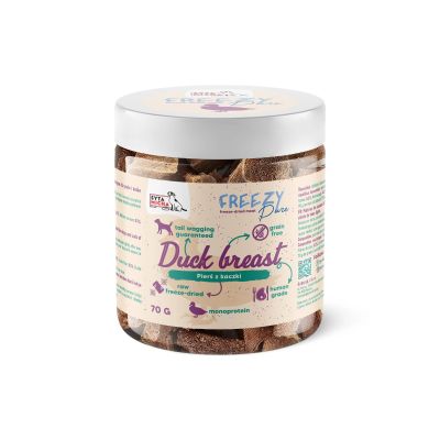 FREEZY Pure z kaczki to produkt bez konserwantów, zbóż, glutenu, soi i gliceryny. Jest idealny dla psów aktywnych, starszych i wrażliwych. Lekkie, chrupiące kawałki nie brudzą rąk i świetnie sprawdzają się zarówno jako nagroda treningowa, jak i dosmaczacz do codziennego posiłku. To zdrowy wybór dla każdego psa, zamknięty w wygodnym opakowaniu, które możesz zabrać wszędzie.