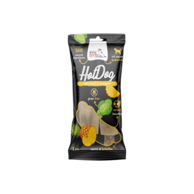 Szukasz zdrowej i wyjątkowo smakowitej przekąski dla swojego psa? Hot Dog z wołowiną i ananasem to naturalny gryzak, który dostarcza psu wartościowych składników odżywczych i jednocześnie zaspokaja jego naturalną potrzebę żucia. Dzięki starannie dobranym składnikom ten smakołyk nie tylko zachwyci psa swoim smakiem, ale także wspomoże jego zdrowie i kondycję.Bazą przysmaku jest skóra wołowa, która zapewnia długie i satysfakcjonujące żucie, a także wspiera higienę jamy ustnej, pomagając usuwać osad nazębny. Wołowina to doskonałe źródło wysokiej jakości białka, które wspomaga rozwój i regenerację mięśni. Dodatek szpinaku dostarcza niezbędnych witamin i minerałów, takich jak żelazo, magnez i potas, które wspierają prawidłową pracę organizmu psa. Ananas to naturalne źródło enzymów trawiennych, witaminy C i przeciwutleniaczy, które wzmacniają odporność i wspierają zdrowie układu pokarmowego.