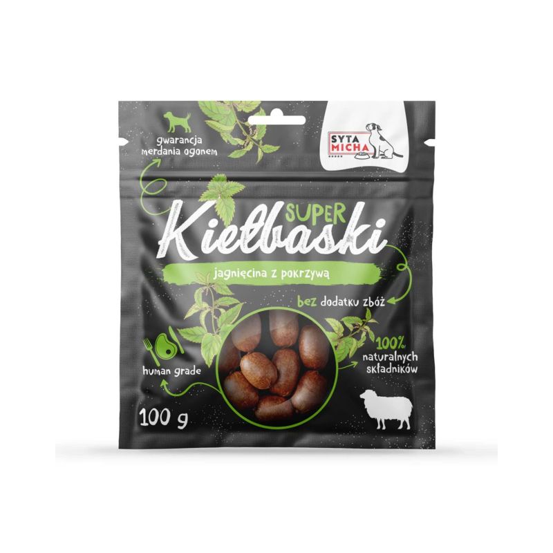 Super kiełbaski z jagnięciną od Sytej Michy to w 100% naturalne, suszone przysmaki stworzone dla psów w każdym wieku. Chrupiąca forma, intensywny aromat i prosty skład sprawiają, że są doskonałą nagrodą, urozmaiceniem codziennej diety lub smacznym dodatkiem między posiłkami – bez sztucznych dodatków i zbędnych wypełniaczy.Aż 95% składu stanowi mięso mięśniowe z jagnięciny – lekkostrawne, pełnowartościowe źródło białka, które wspiera budowę i regenerację mięśni. Jagnięcina jest niskokaloryczna, a zawarta w niej L-karnityna pomaga w utrzymaniu prawidłowej masy ciała psa. Obecność witamin A oraz witamin z grupy B (B3 i B12) wspiera zdrową skórę, lśniącą sierść oraz prawidłowe funkcjonowanie wzroku.
