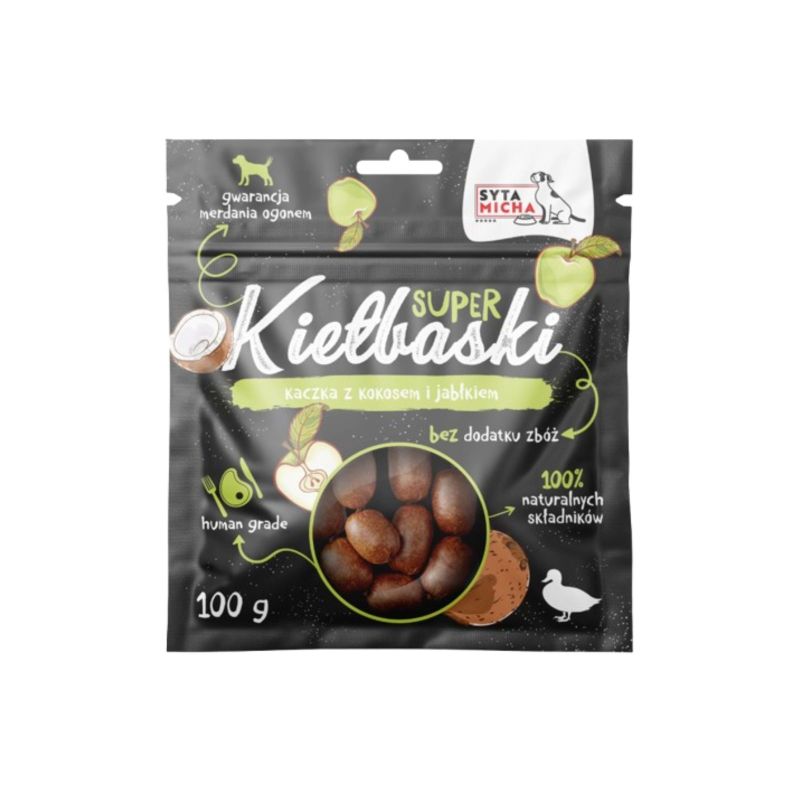 Naturalna przekąska dla psa, która łączy wysoką zawartość mięsa kaczki z dodatkami superfoods – kokosem i jabłkiem. SUPER kiełbaski z kaczki to lekkostrawne, smakowite smakołyki o wysokiej wartości odżywczej. Dzięki delikatnemu procesowi suszenia zachowują swoje cenne składniki odżywcze, dostarczając psu zdrowych tłuszczów, witamin i minerałów wspierających odporność, układ nerwowy oraz zdrowie skóry i sierści.Mięso kaczki wyróżnia się wysoką zawartością nienasyconych kwasów tłuszczowych oraz witaminy A, która wspomaga wzrok i proces regeneracji organizmu. Dodatek kokosa wspiera funkcje poznawcze i pracę układu nerwowego, a jabłko dostarcza błonnika oraz witamin, wpływających na prawidłowe trawienie i odporność. Kiełbaski nie zawierają konserwantów, gliceryny ani sztucznych dodatków, dzięki czemu są zdrowym i bezpiecznym wyborem dla psów w każdym wieku.