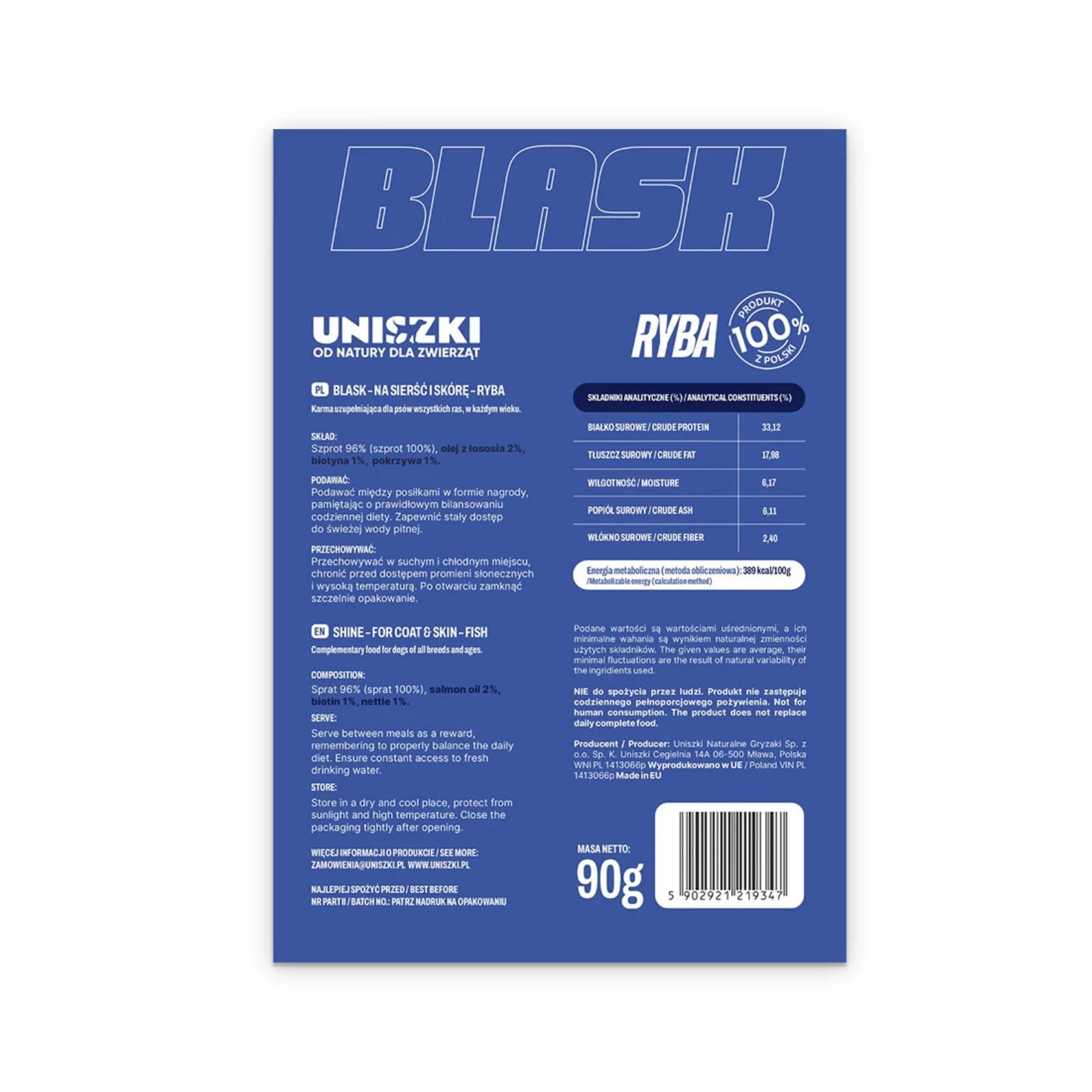 Blask na sierść i skórę – Ryba to funkcjonalne smaczki stworzone z myślą o psach wszystkich ras i w każdym wieku, które potrzebują wsparcia kondycji skóry oraz pięknej, lśniącej sierści. To uzupełniająca karma w formie naturalnej nagrody, do podawania między posiłkami jako element codziennej diety.
