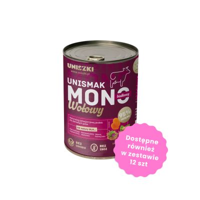 UNISMAK Mono Wołowina to starannie opracowana, pełnoporcjowa karma mokra dla dorosłych psów, oparta wyłącznie na jednym źródle białka – mięsie wołowym. Stworzona we współpracy z dietetykiem zwierzęcym, spełnia potrzeby nawet najbardziej wymagających psich brzuszków. Dzięki zawartości aż 95% mięsa (w tym mięso, wątroba i płuca wołowe), dostarcza pełnowartościowego, łatwoprzyswajalnego białka, wspomagającego budowę mięśni oraz prawidłowy rozwój kości.