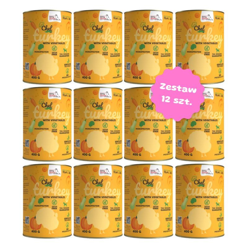 Zestaw 12 puszek karmy monobiałkowej - Syta Micha CHEF Indyk z warzywami